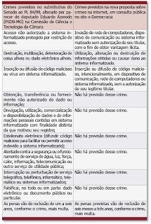 A seguir, veja as principais diferenças entre os dois projetos voltados a tipificar e punir os crimes na internet no Brasil (imagem divulgada pela Agência Câmara. Clique em cima da mesma para ampliá-la):